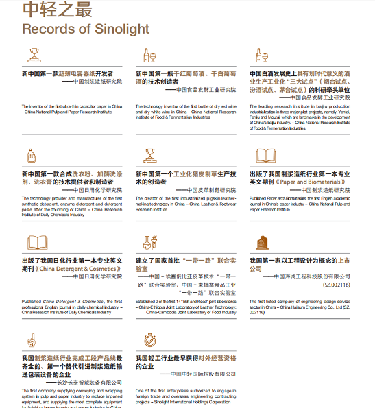 中(zhōng)輕(qīng)集團(tuán)作為國家第四批創新型試點企業,擁有輕工相(xiàng)關行業貫通科研(yán)、設計、智造等完整產業鏈的綜合集成(chéng)服務能力,是(shì)我國輕工行(háng)業科技進步和行業(yè)轉(zhuǎn)型(xíng)升級的引領者,始終發揮著國有企業(yè)在輕工行業的控製力、影響力和帶動力。