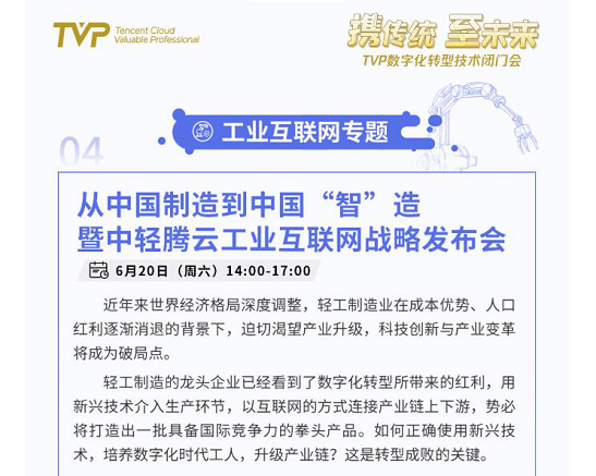 (中輕工業互聯網攜手騰(téng)訊雲聯合打造TVP數字化轉型(xíng)技術閉門會,暨中輕騰雲工業互聯網戰略發布(bù)會)