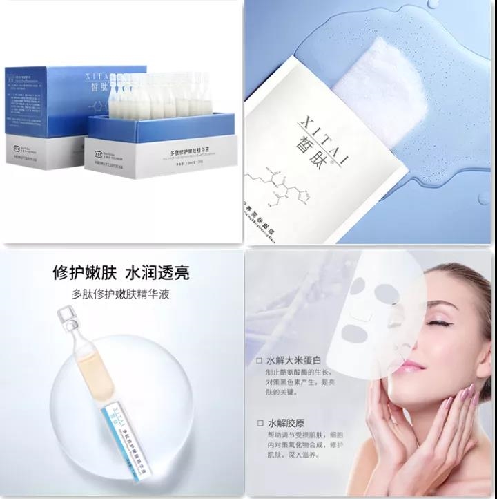 多肽修護嫩膚精華液和多肽修護麵膜以保利中輕自有專利技術提取的海洋膠原三肽、大米三肽為核(hé)心原料,具有美白、嫩(nèn)膚、修護等功效(xiào)