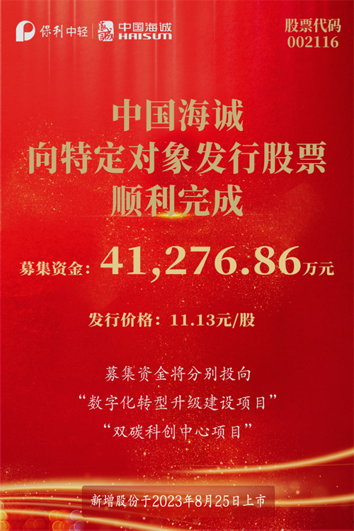 2023年8月8日,保利中輕所屬中國海(hǎi)誠成功向特定對象發行(háng)股票並(bìng)完成資金募集,新增股份於8月25日上市