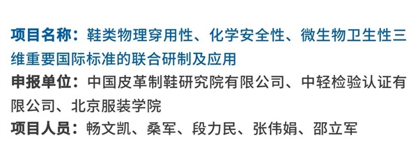 中國(guó)皮革製鞋院(yuàn)聯(lián)合申報的“鞋類物理穿(chuān)用性、化學安全性、微生物衛生性三維(wéi)重要國際標準的聯合研製(zhì)及應用”項目,主導製定的國際標準ISO19574、ISO20535和ISO19577,打破(pò)多年來歐盟成員國技(jì)術壟斷,實現我國在鞋類微生物、物理和化學領域國際標準的突破,填補(bǔ)物理和(hé)化學檢測方法標準的國(guó)際空白。
